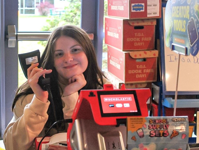 Tenth-grader Shelby Young helps as a cashier at the Scholastic Book Fair.