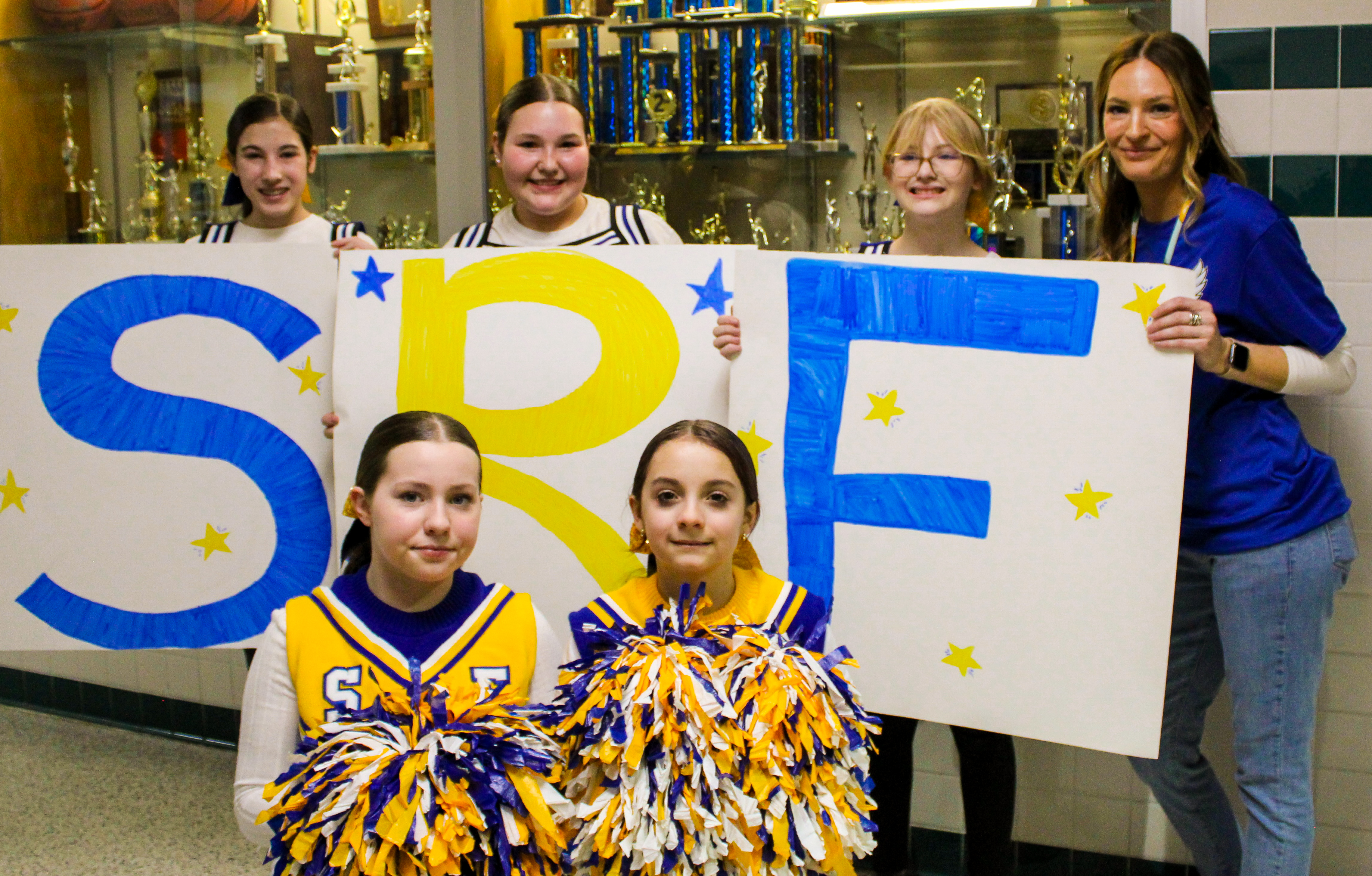 The school gym was supercharged with energy when staff took on the students in basketball on the evening of March 5 in an event that raised money for the school basketball program. Seventh-grade girls, coached by Ms. Crites and Ms. Campbell, revived the school's cheerleading squad and performed several choreographed routines. The referees were 10th-grader Eli White and Principal Kate Cruickshank. The game went to overtime, and students won on a late 3-pointer by Jaiden Franze. They triumphed again the next day when the teams repeated the match in front of the whole student body.